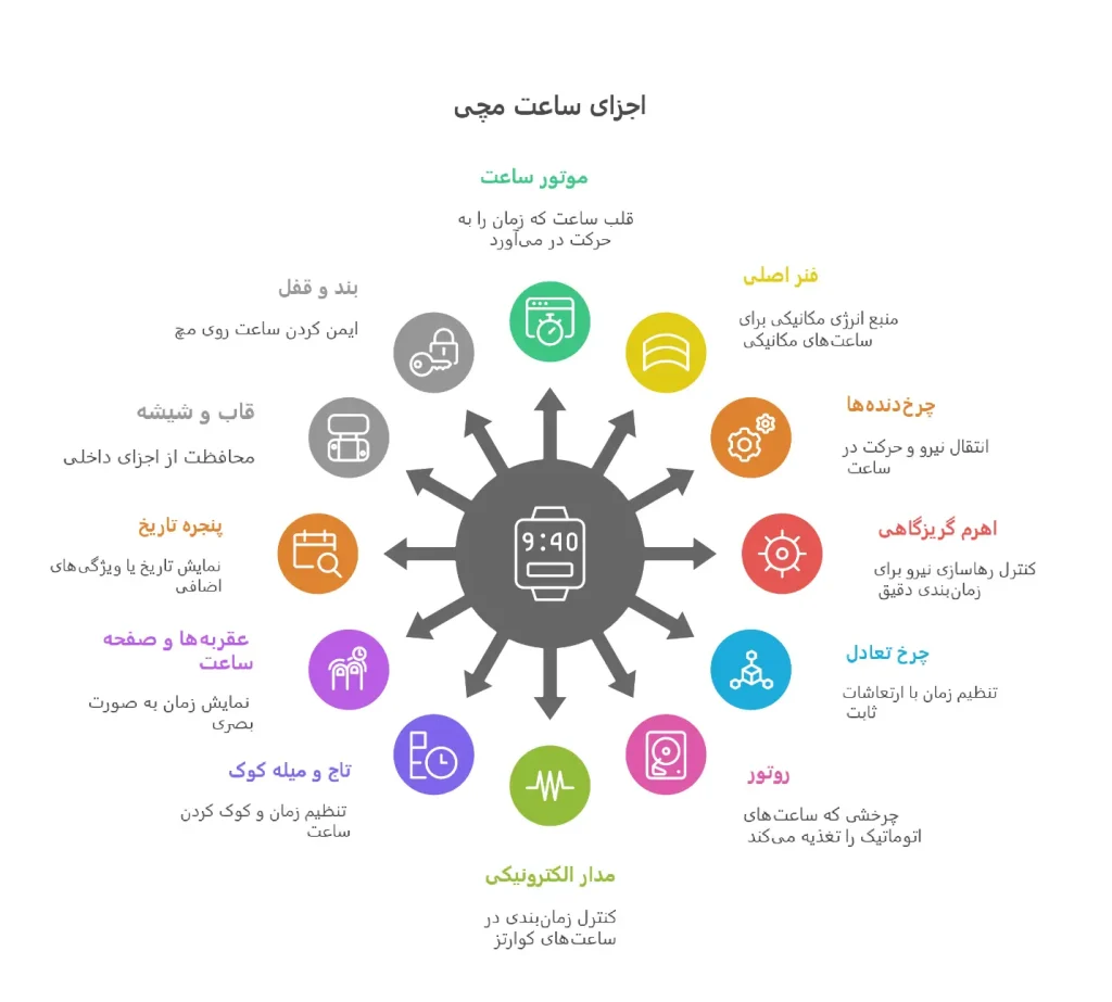 اجزای اصلی ساعت مچی شامل منبع انرژی مثل فنر یا باتری، شبکه چرخدندهها، بخش تنظیم ضربان مانند چرخ تعادل یا کریستال کوارتز، و سازوکار نمایش زمان است. هرکدام نقشی مشخص دارند: ذخیره و تأمین انرژی، انتقال دقیق حرکت و ایجاد ریتم منظم برای نمایش درست زمان.
